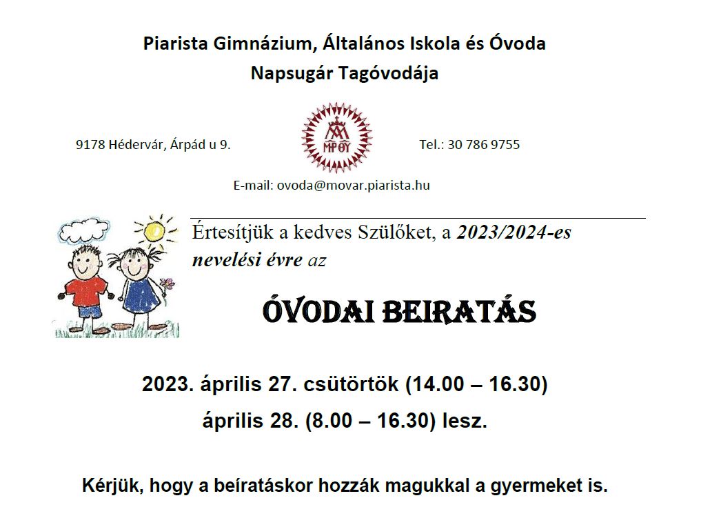Kedves Szülők! Iskolánk 2023. április 17-ig fogadja a szülők beiratkozási kérelemét, mely benyújtását elsősorban elektronikus úton várjuk. A beiratkozási kérelem az alábbi linkről tölthető le: Szándéknyilatkozat A beiratkozási kérelem elutasítása esetén a szülők a döntés kézhezvételétől számított 15 Bővebben …